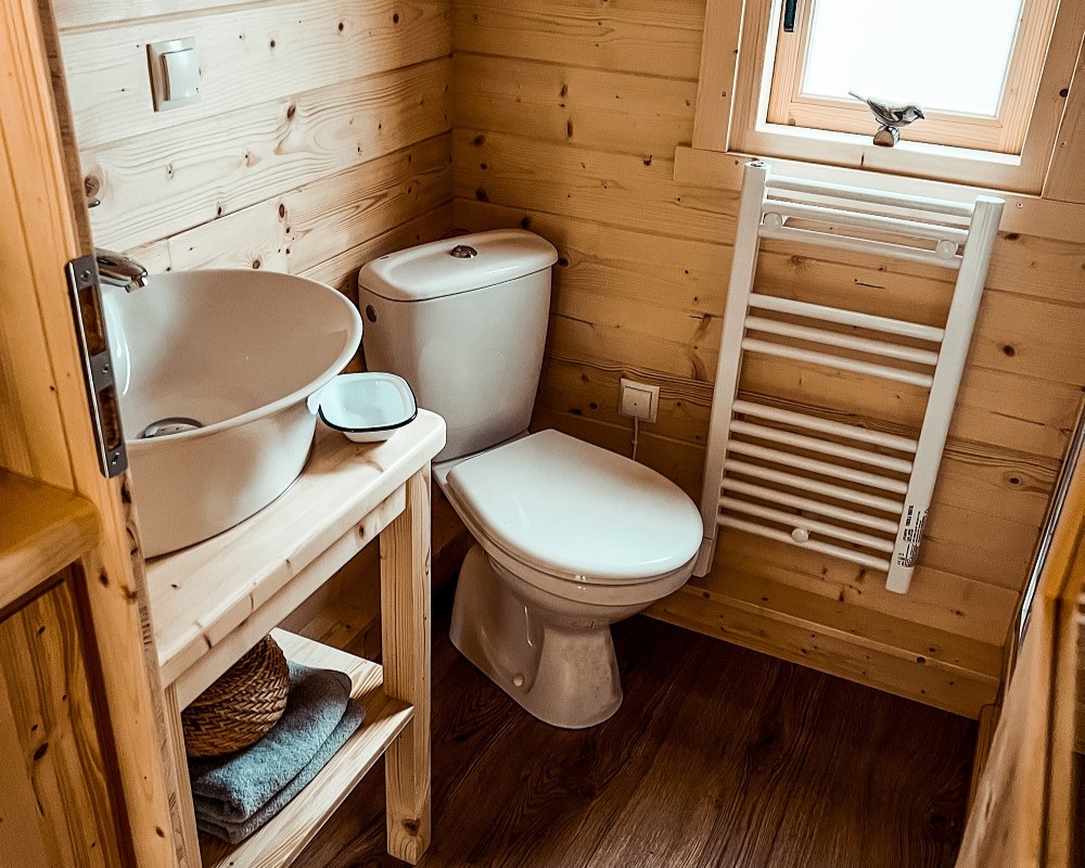 Im hinteren Bereich des Eifelhüttchens befindet sich das Bad mit Dusche, WC, Waschbecken und kleinem Fenster.